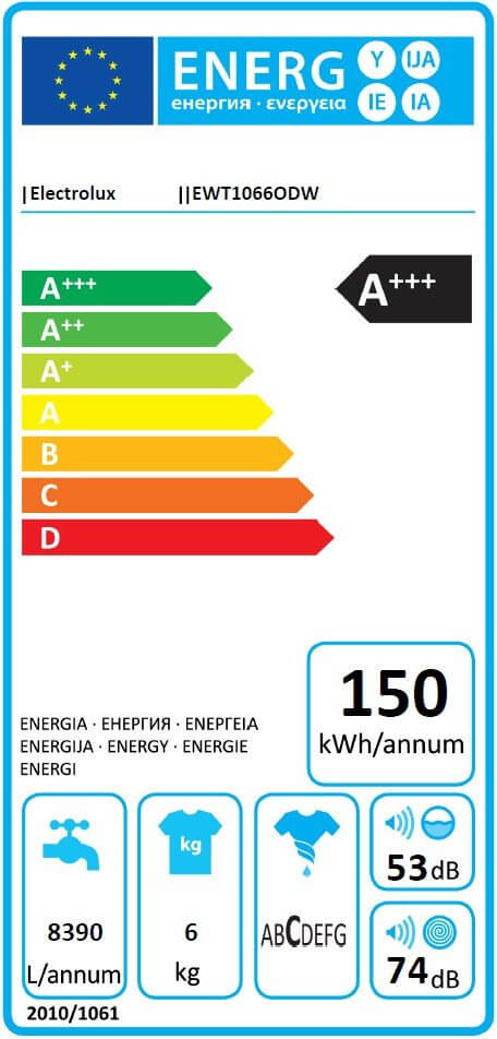 Energetický informační list Instalace Volně stojící spotřebič Kapacita praní (kg) 6 Energetická třída A+++ Účinnost praní A Účinnost odstřeďování C Max. rychlost odstřeďování (ot./min.) 1000 Příkon (W) 2200 Odhadovaná roční spotřeba (kWh) 150 Spotřeba energie - bavlna 60°C (kWh) 0.83 Spotřeba en., poloviční náplň - bavlna 60°C (kWh) 0.55 Spotřeba en., poloviční náplň - bavlna 40°C (kWh) 0.42 Spotřeba energie ve stavu vypnuto (W) 0.48 Spotřeba energie v pohotovostním režimu (W) 0.48 Trvání pohotovostního režimu (min.) 5 Roční spotřeba vody (l) 8390 Obvyklý program Bavlna 60, poloviční a plná náplň, Bavlna 40, poloviční náplň Čas praní - bavlna 60°C (min) 182 Čas praní - bavlna 40°C (min) 170 Čas praní - bavlna, poloviční náplň 40°C (min) 129 Hlučnost při praní dB(A) 53 Hlučnost odstřeďování dB(A) 74 Spotřeba energie (kWh) - Trvání programu Bavlna 60 0.83 - 182 Spotřeba (kWh) - Bavlna 60 (min.), 1/2 náplň 0.55 - 145 Spotřeba (kWh) - Bavlna 40 (min.), 1/2 náplň 0.42 - 129 Spotřeba vody (l) 45 Spotřeba (kWh) - Roční spotřeba vody (l) 150 - 8390