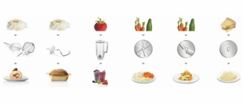 | Včetně příslušenství | 1 x víko, 1 x průběhový kotouč, 1 x nerezová míchací mísa, 1 x kovové hnětací háky, 1 x umělohmotný mixer, 1 x strouhací kotouč, 1 x kotouč na jemné strouhání, 1 x míchací metly, 1 x šlehací metly, 1 x krájecí kotouč |