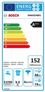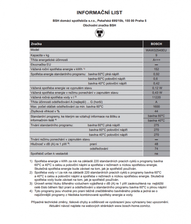 roční spotřeba energie 152 kWh na základě 220 standardních pracích cyklů v programech pro bavlnu při 60 °C a 40 °C s celou a částečnou náplní a spotřeby v úsporných režimech;