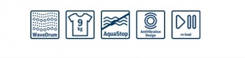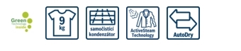 speciální programy: odčerpání, peří, tmavé prádlo, košile/halenky, sport/fitness, extra krátký 15, mix, máchání/odstředění, AlergiePlus, čištění bubnu s funkcí připomenutí, vlna/ruční praní, jemné/hedvábí