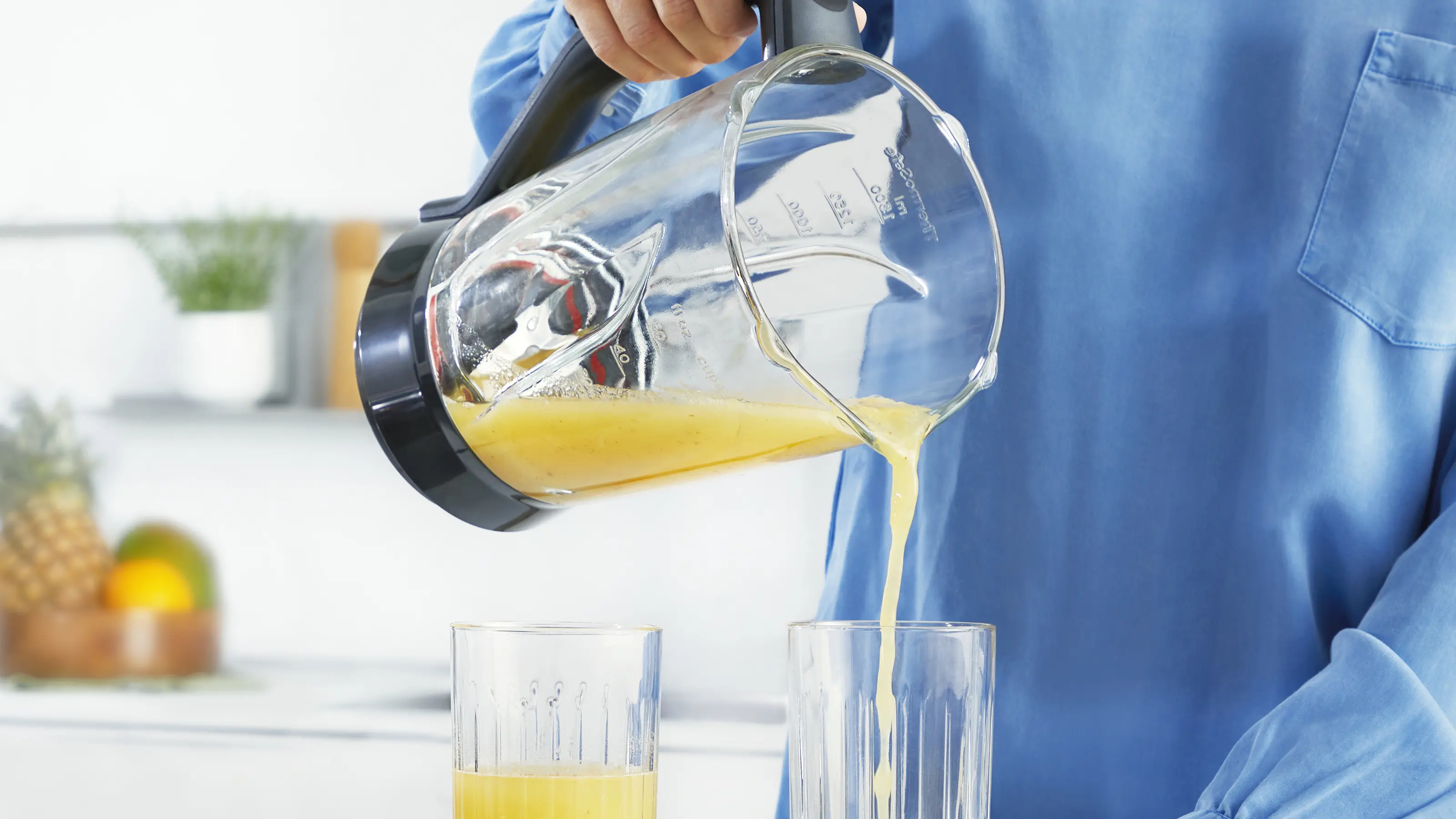 Silnostěnná mixovací nádoba ThermoSafe z tepelně odolného skla o objemu 2,3 l (užitný objem: 1,5 l) umožňuje snadné a bezpečné mixování horkých polévek i ledově studených nápojů. Speciální tvar nádoby potlačuje hluk při mixování