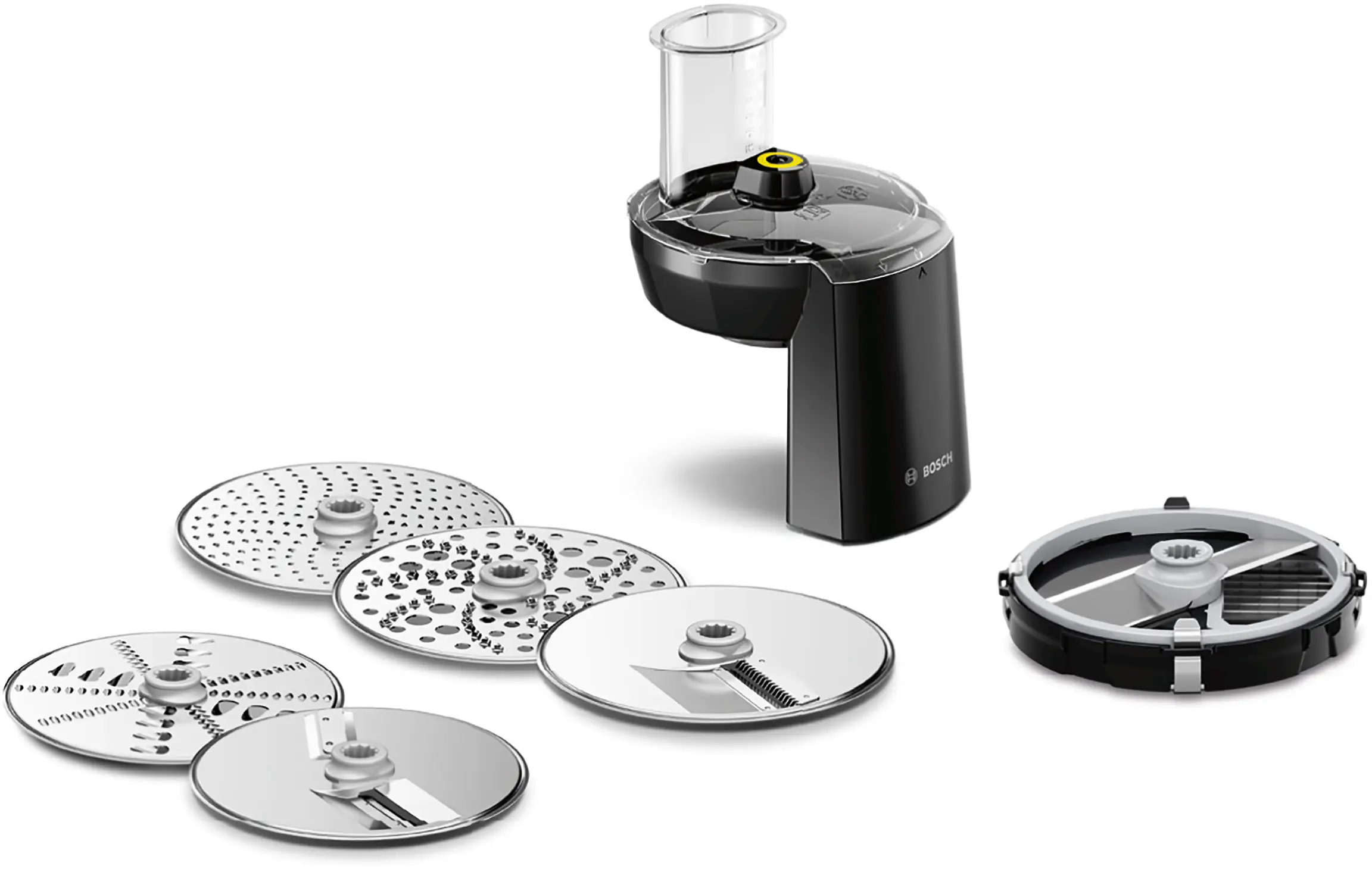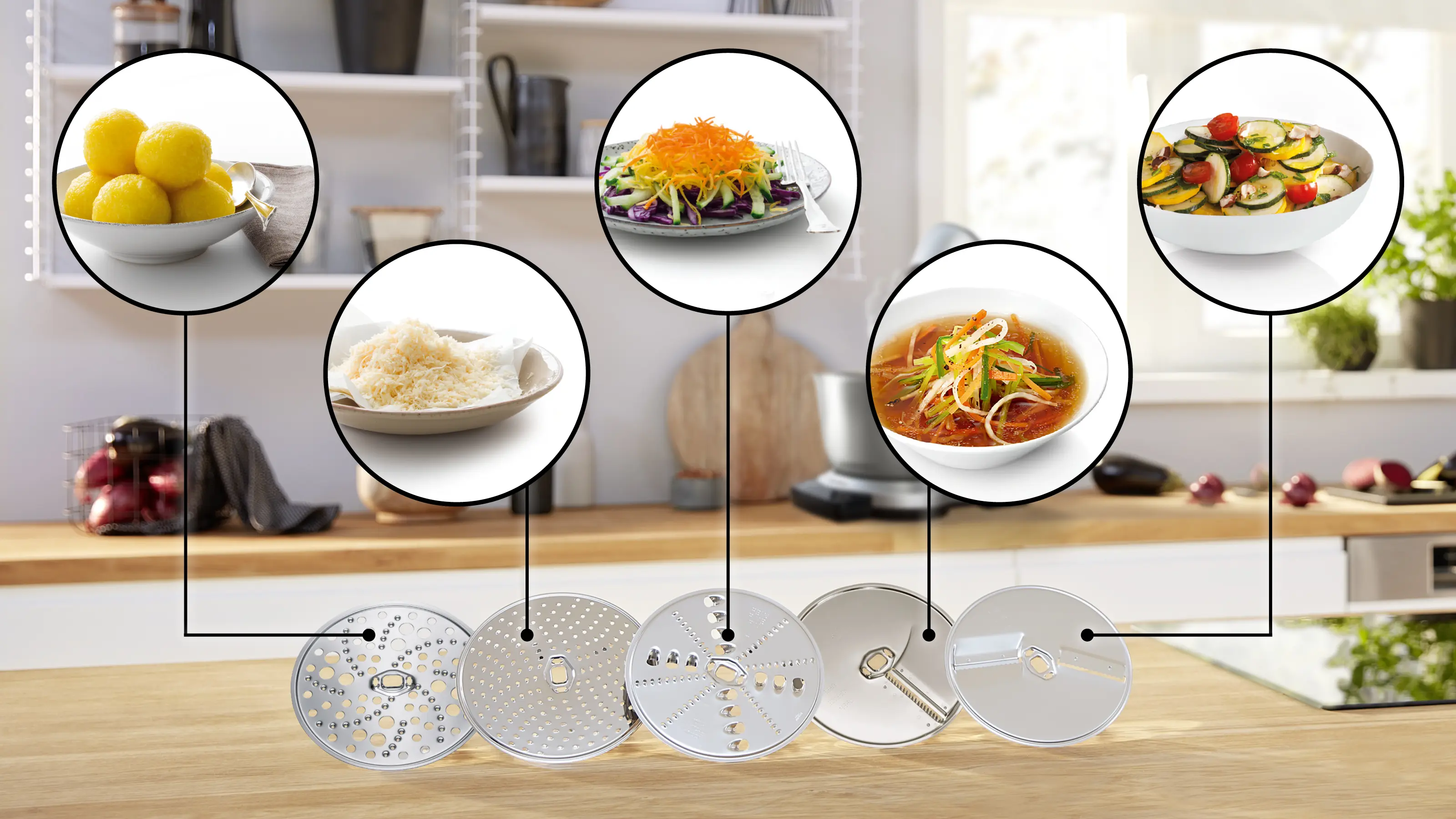 Průběhový krouhač s 5 nerezovými kotouči na krájení, strouhání a krouhání: oboustranný kotouč na tenké a tlusté plátky, oboustranný kotouč na krouhání (hrubé a jemné), kotouč na středně hrubé strouhání, kotouč na jemné strouhání a kotouč na nudličky (např. do asijských jídel).