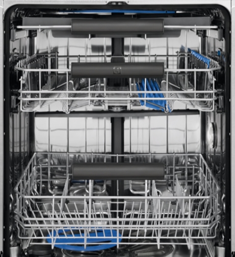 Horní košík má 2 skládací držáky, 2 skládací drátěné držáky pro skleničky, 2 měkké špičky, 6 měkkých špiček pro vinné sklenky, skládací poličky na šálky, Plastové držadlo