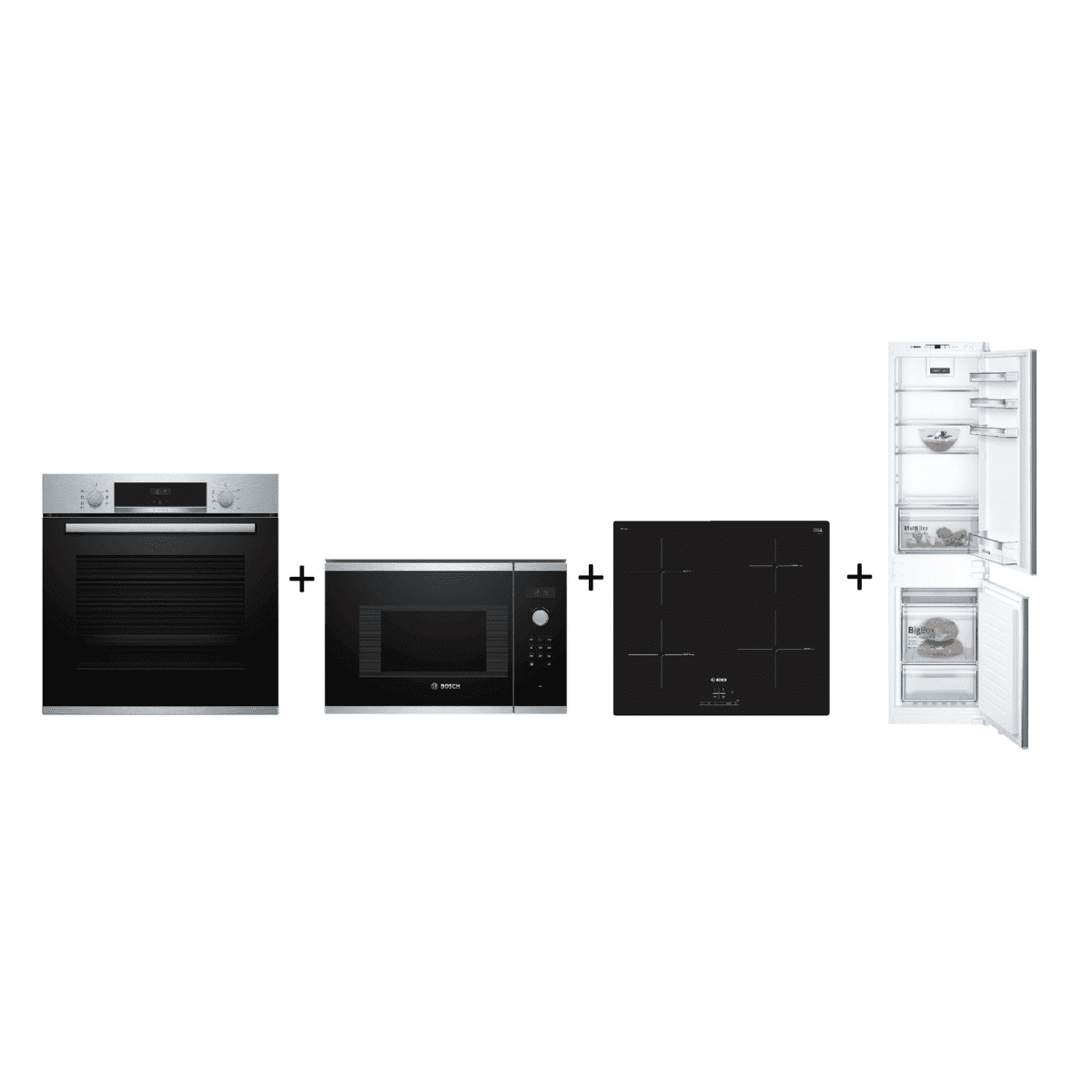 Set vestavných spotřebičů Bosch - horkovzdušná trouba + mikrovlnná trouba + indukční varná deska + vestavná chladnička s mrazákem