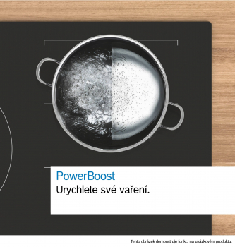 PowerBoost (nastavitelné pro všechny varné zóny): využijte o 50 % více výkonu při vaření např. vody, než nabízí nejvyšší standardní stupeň výkonu