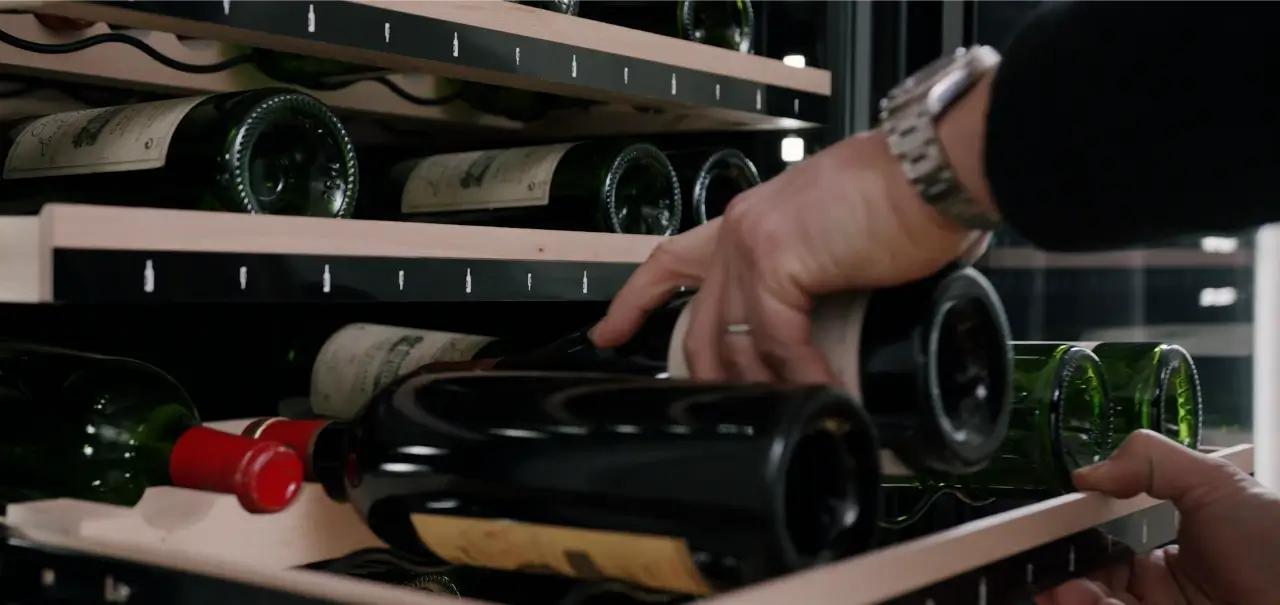 Vína můžete uskladnit na celkem 14 výsuvných dřevěných smart policích s LED indikací lahví. Snadnou manipulaci zajišťují 2 výškově stavitelné nožky a 2 zadní transportní kolečka.