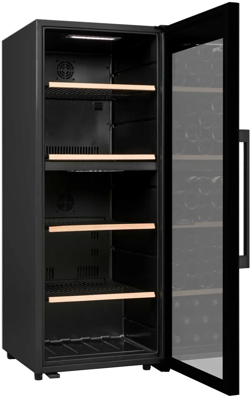 Volně stojící vinotéka se 2 nezávislými chladícími zónami; Rozsah nastavení teplot v zónách: 5-12 °C (horní), 12-20 °C (spodní); Kapacita: 110 lahví; Bílé LED osvětlení s vypínačem; 2 vrstvy tvrzeného skla s černým tónováním a UV filtrem ve dveřích; Rám z černého skla s černým madlem; Elektronická regulace teploty s displejem v bílé barvě; Antivibrační systém; 4 polovýsuvné drátěné police s dřevěným čelem; Kompatibilní s aplikací Vinotag; Dětský zámek; Roční spotřeba energie: 111 kWh; Energetická třída: F; Hlučnost 38 dB; Rozměry (VxŠxH): 125,5 x 50 x 54 cm