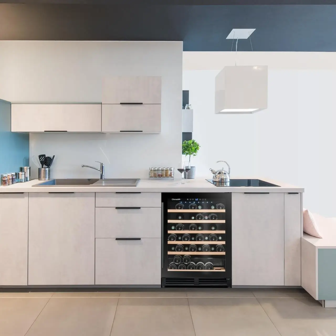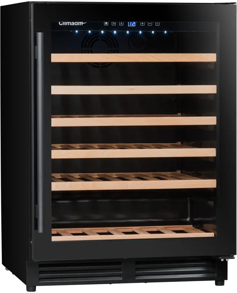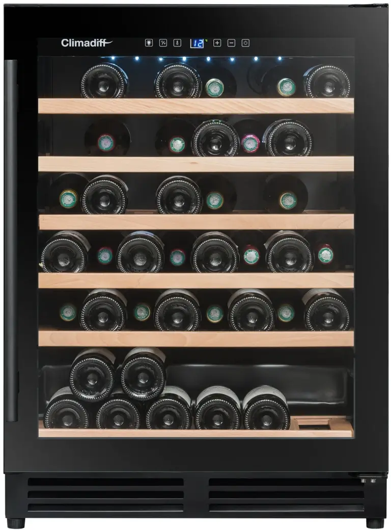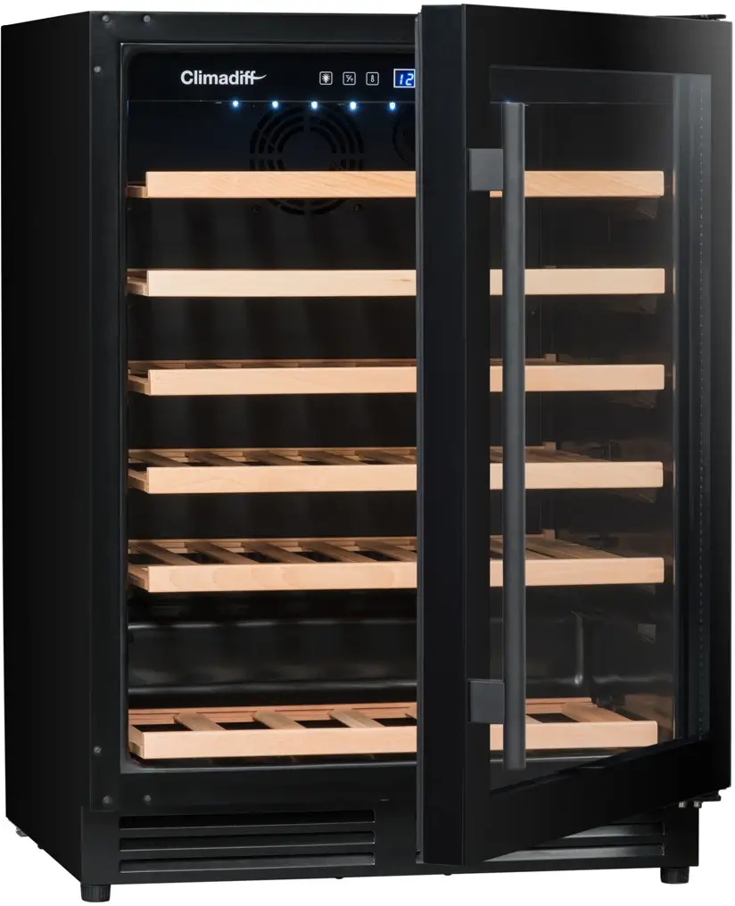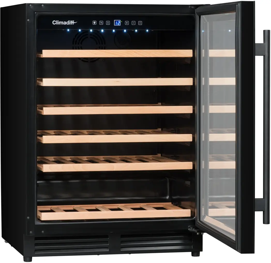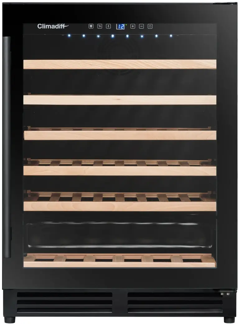 Jednozónová vinotéka značky Climadiff s možností instalace jako volně stojící nebo vestavěná pod pracovní deskou; kapacita 51 lahví, rozsah nastavení teplot 5-20 °C; prosklené dveře s černým rámem a madlem, 2 vrstvy tvrzeného tónovaného skla; kovově černé tělo vinotéky; možnost změny směru otevírání dveří; bílé LED osvětlení s vypínačem; 4 výškově stavitelné nožky; 5 ks pevných dřevěných polic a 1 poloviční dřevěná police; elektronická regulace teploty; digitální displej; automatické odmrazování; systém aktivní ventilace; antivibrační systém; energetická třída F; klimatická třída SN-N; roční spotřeba energie 101 kWh; použitelná při okolní teplotě 10-32 °C; hlučnost 41 dB; hmotnost 46 kg; rozměry (Š x H x V) 59,5 x 57,5 x 82 cm