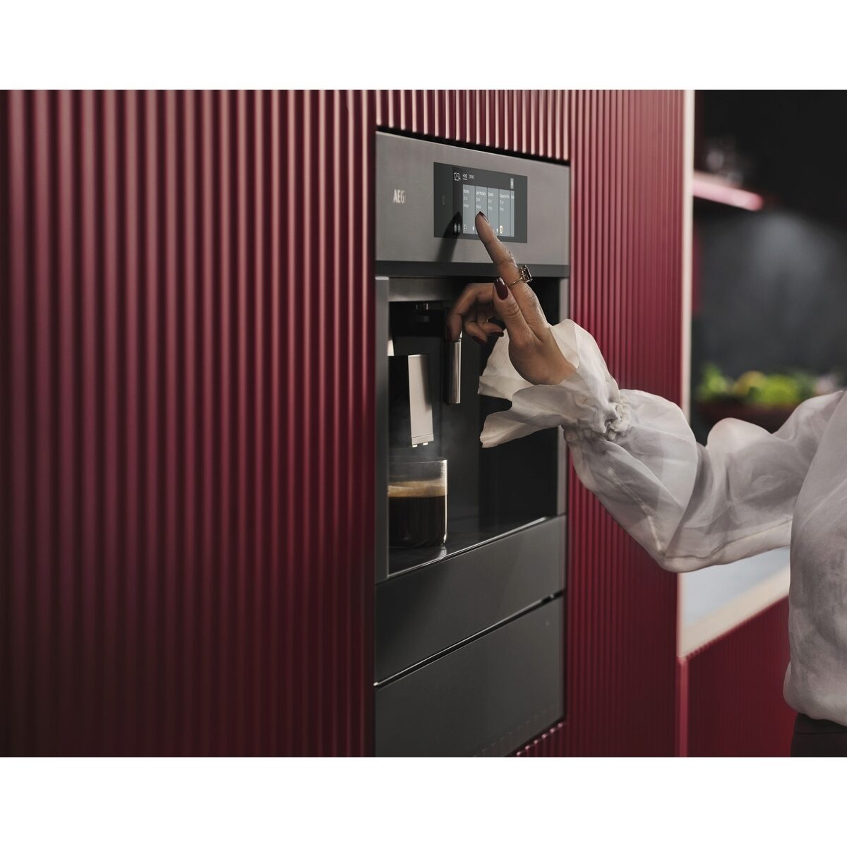 Vestavěný kávovar s extra širokým dotykovým ovládáním pro efektivní navigaci. Připravte si a vychutnejte výběr kávy, espressa a dalších horkých nápojů přesně tak, jak je máte rádi – v pohodlí domova.