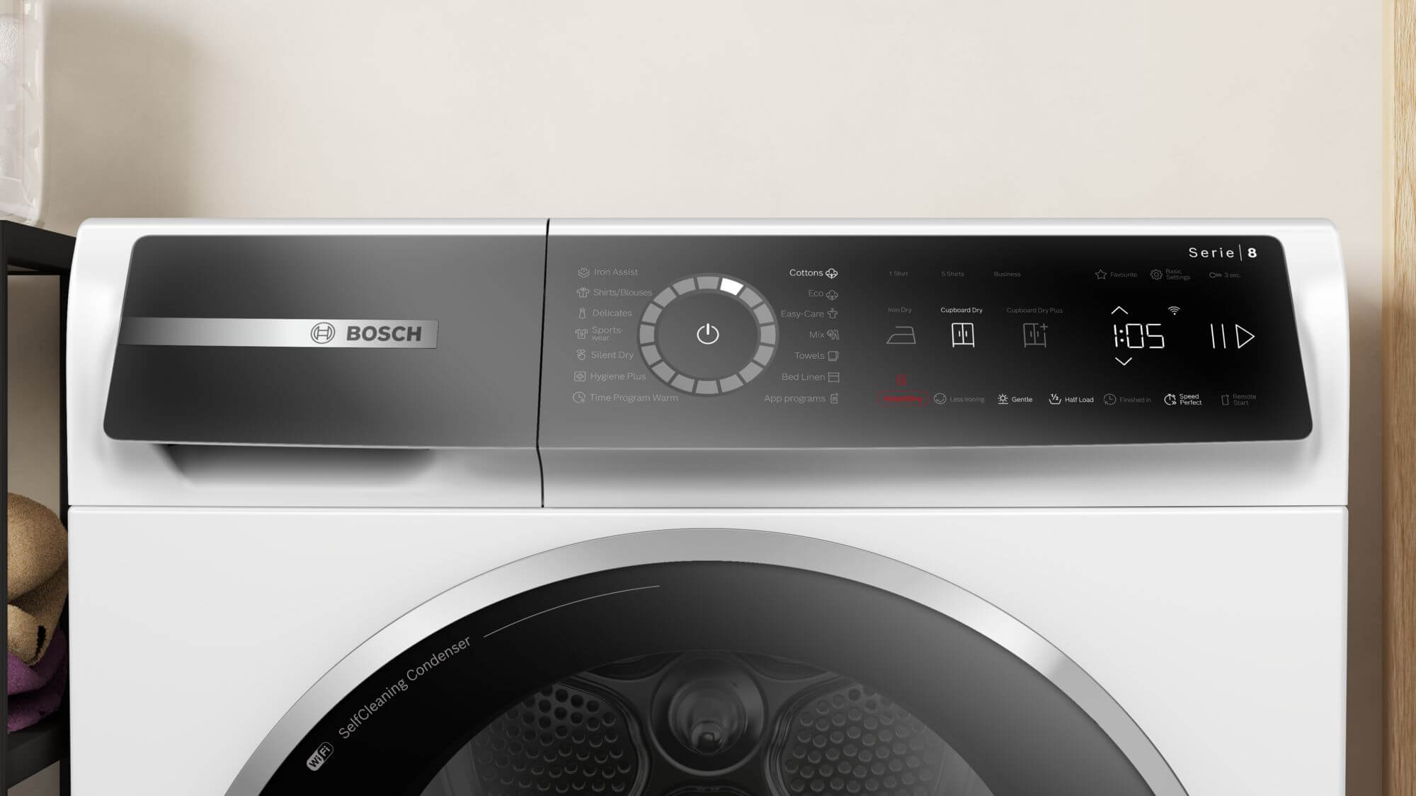 speciální programy: další programy přes aplikaci, bavlna, ložní prádlo, košile/halenky, bavlna eco, peří, jemné, ručníky, Hygiena Plus, mix, tiché sušení, sport/fitness, snadno udržovatelné, časový program teplý