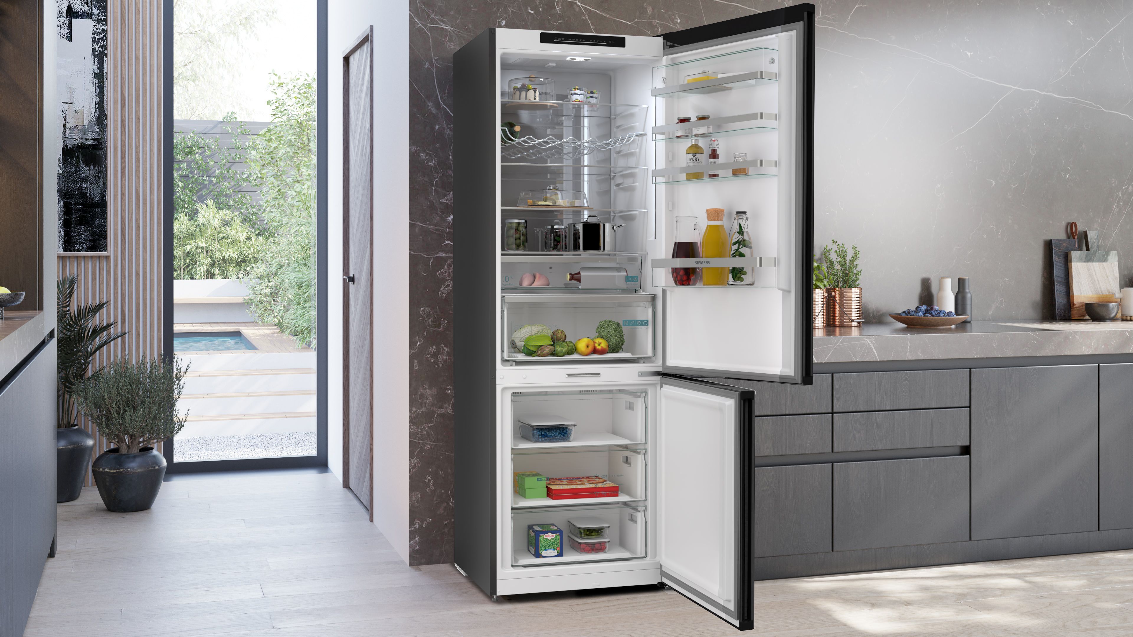 iQ500 Volně stojící chladnička s mrazničkou dole 203 x 70 cm BlackSteel